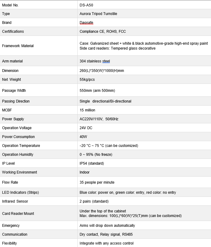 DS-A50 on Daosafe Aurora seeria kolmhark-turnikee, millel on järgmised eelised: