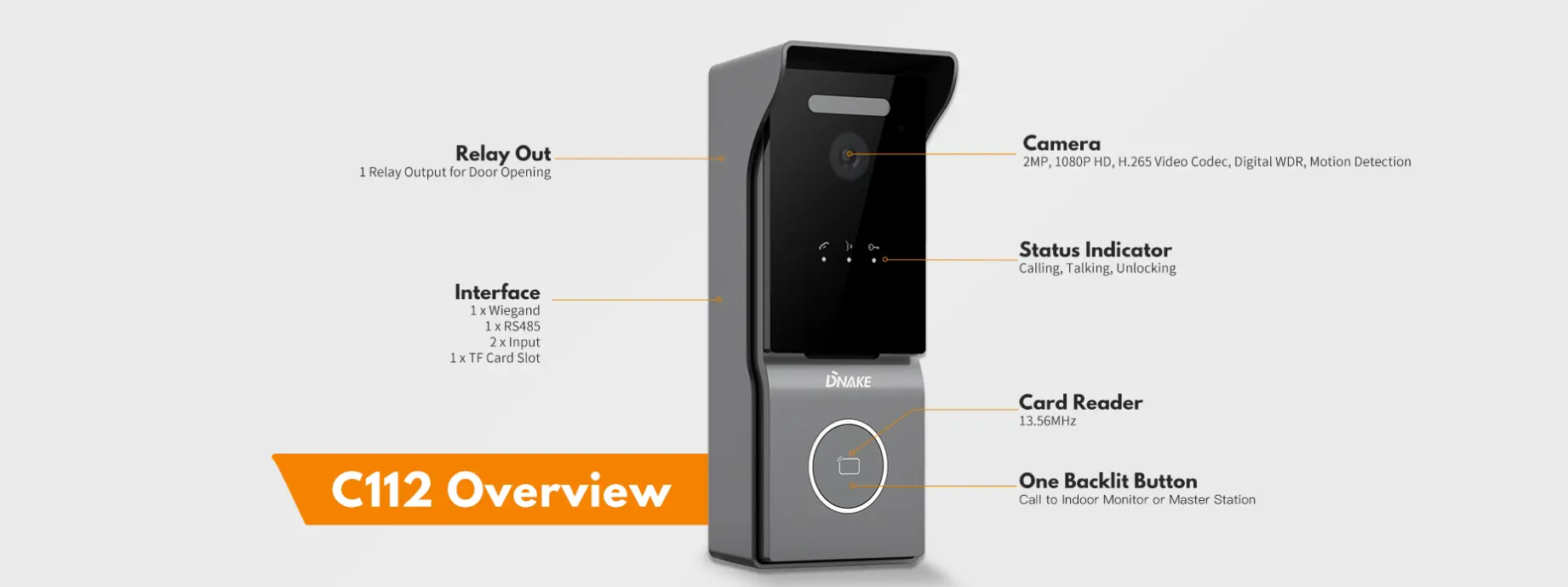 DNAKE C112 võimaldab suhelda hoone sissepääsuga videokõne teel ning avada ukse mugavalt eemalt – kas sisemonitorilt või mobiilirakendusest.. Samuti võimaldab see lihtsat integreerimist teiste SIP-seadmetega.