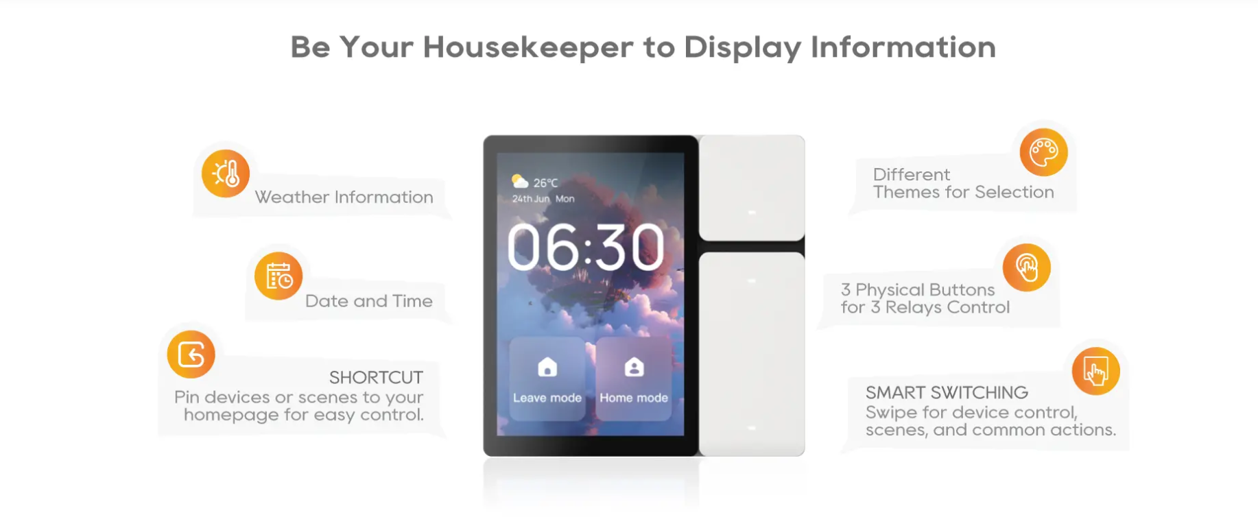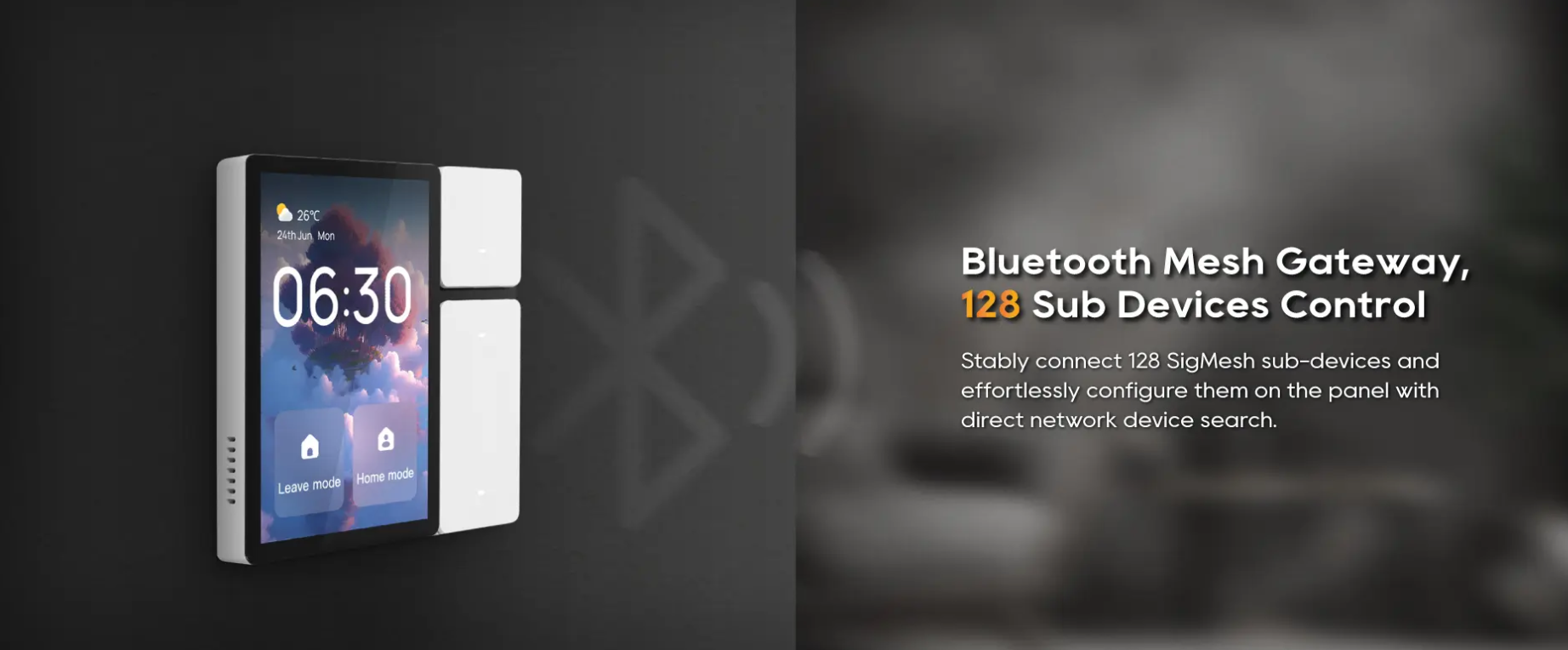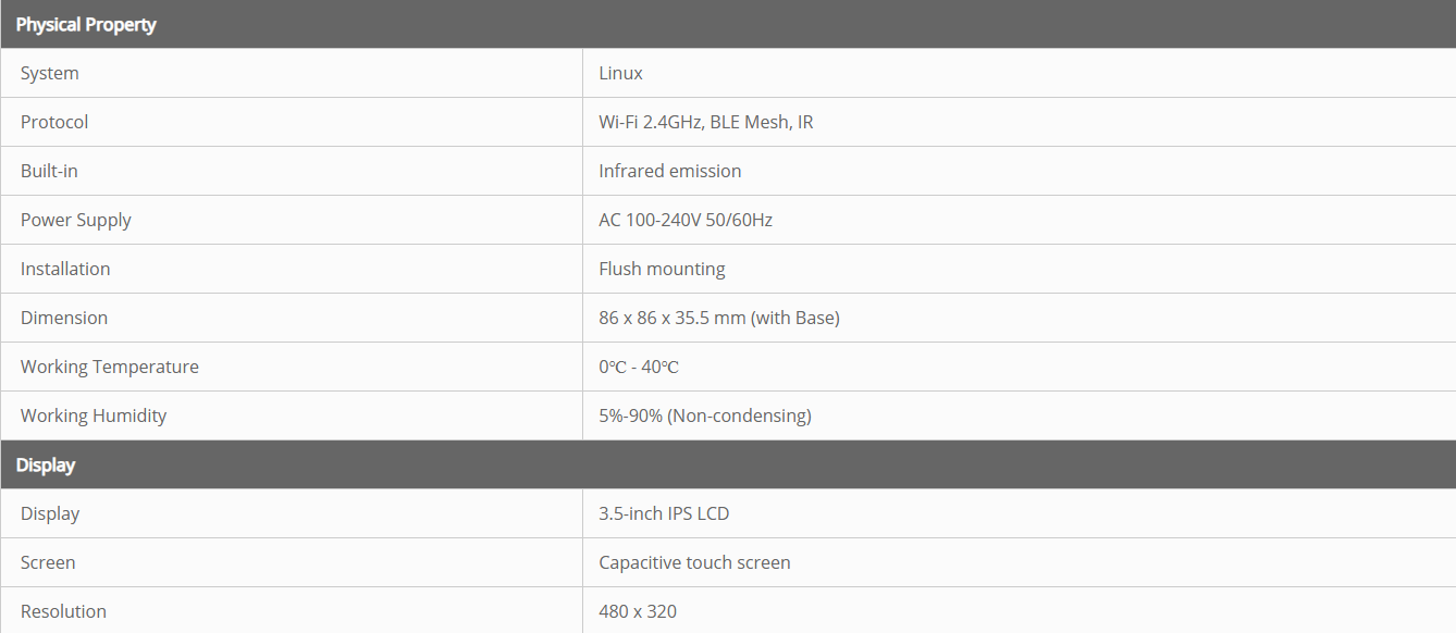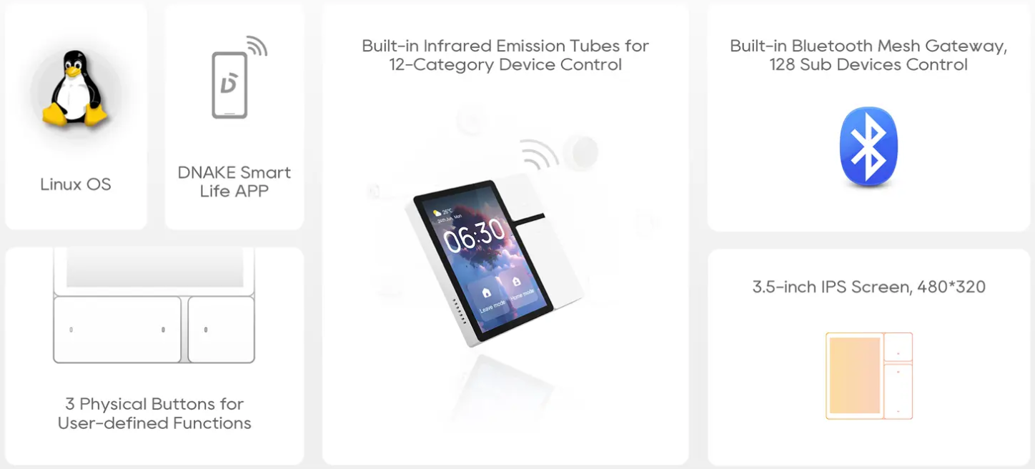 3,5-tollise IPS-ekraaniga nutikodu juhtpaneel on multifunktsionaalne interaktiivne seade, mis ühendab endas kolm füüsilist nuppu, BLE Mesh lüüsi, kolm releekanali väljundit ja infrapuna kaugjuhtimise.