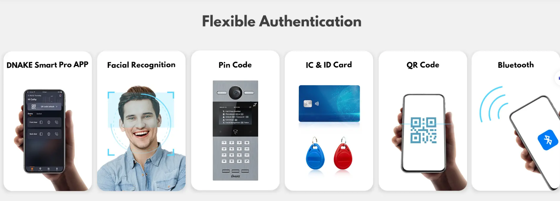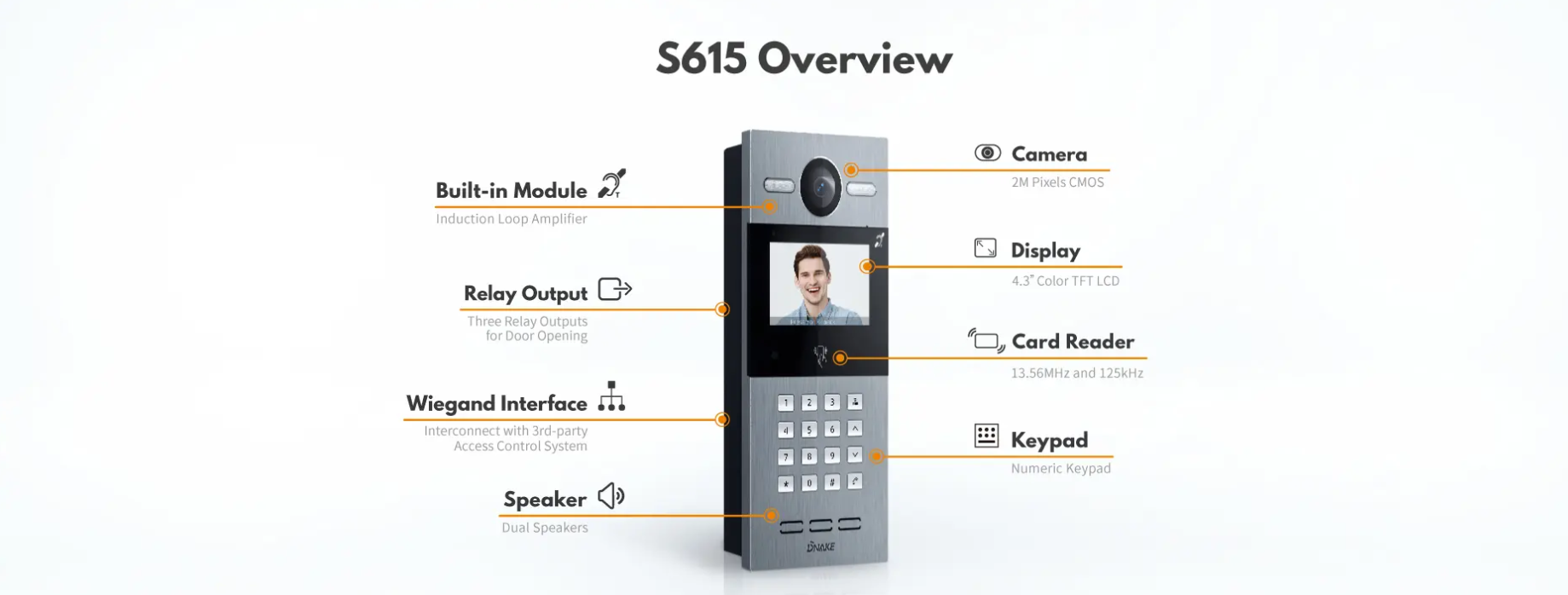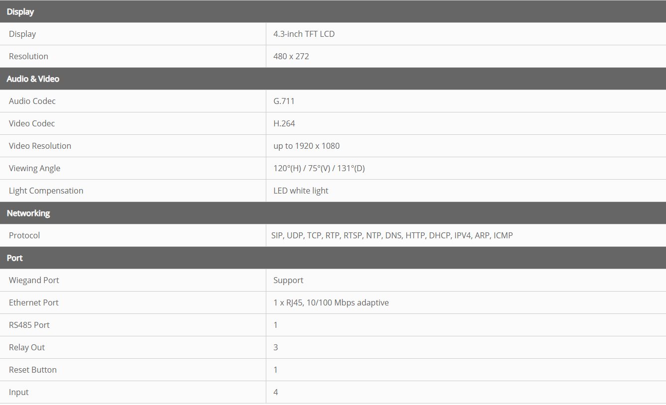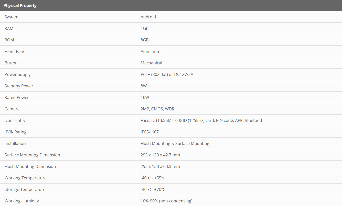 • Uksest sisenemise viisid: kõne, näotuvastus, IC-kaart (13,56 MHz), ID-kaart (125 kHz), PIN-kood, rakendus, Bluetooth