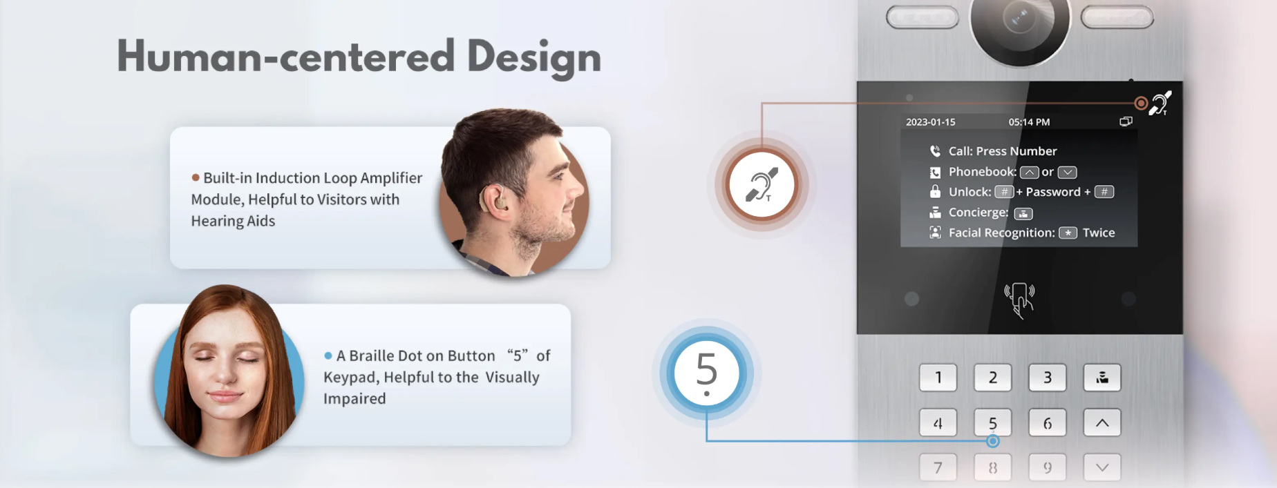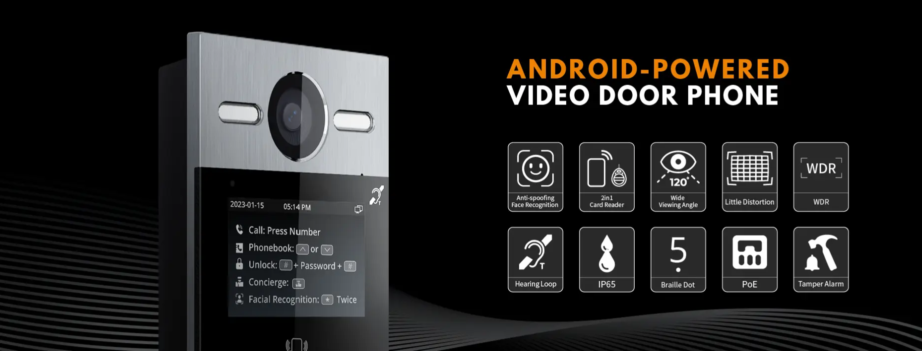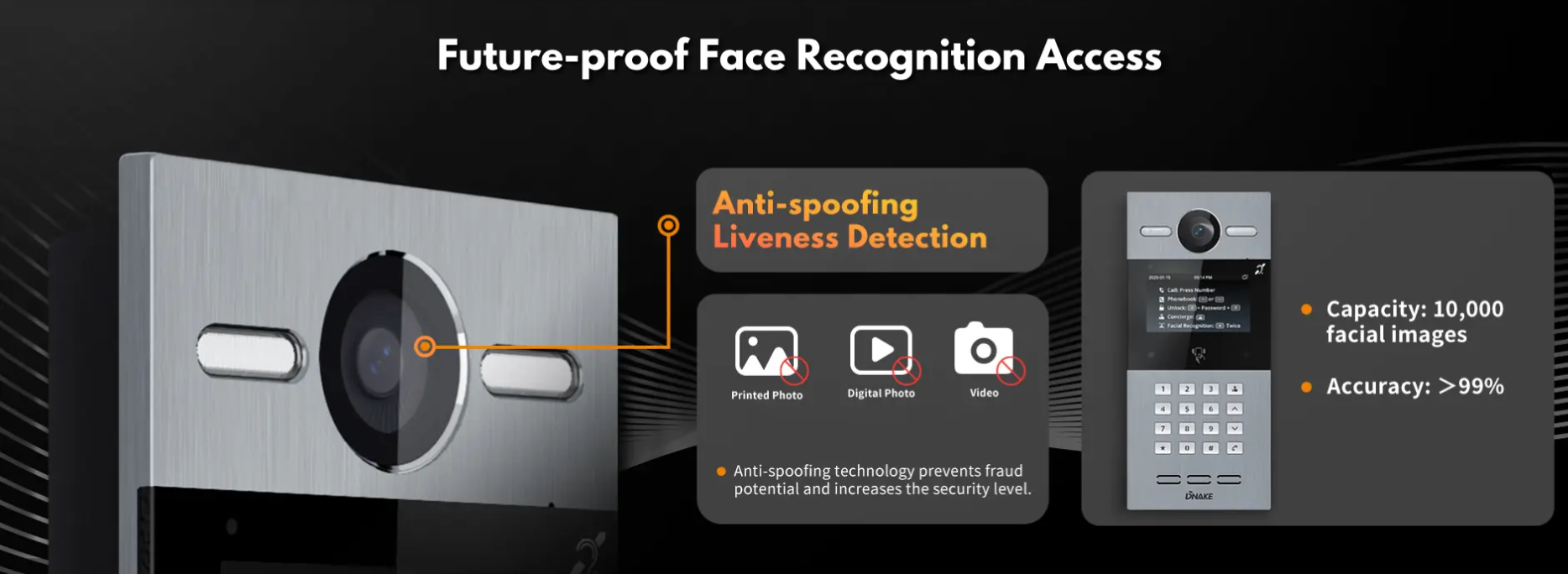 • Uksest sisenemise viisid: kõne, näotuvastus, IC-kaart (13,56 MHz), ID-kaart (125 kHz), PIN-kood, rakendus, Bluetooth