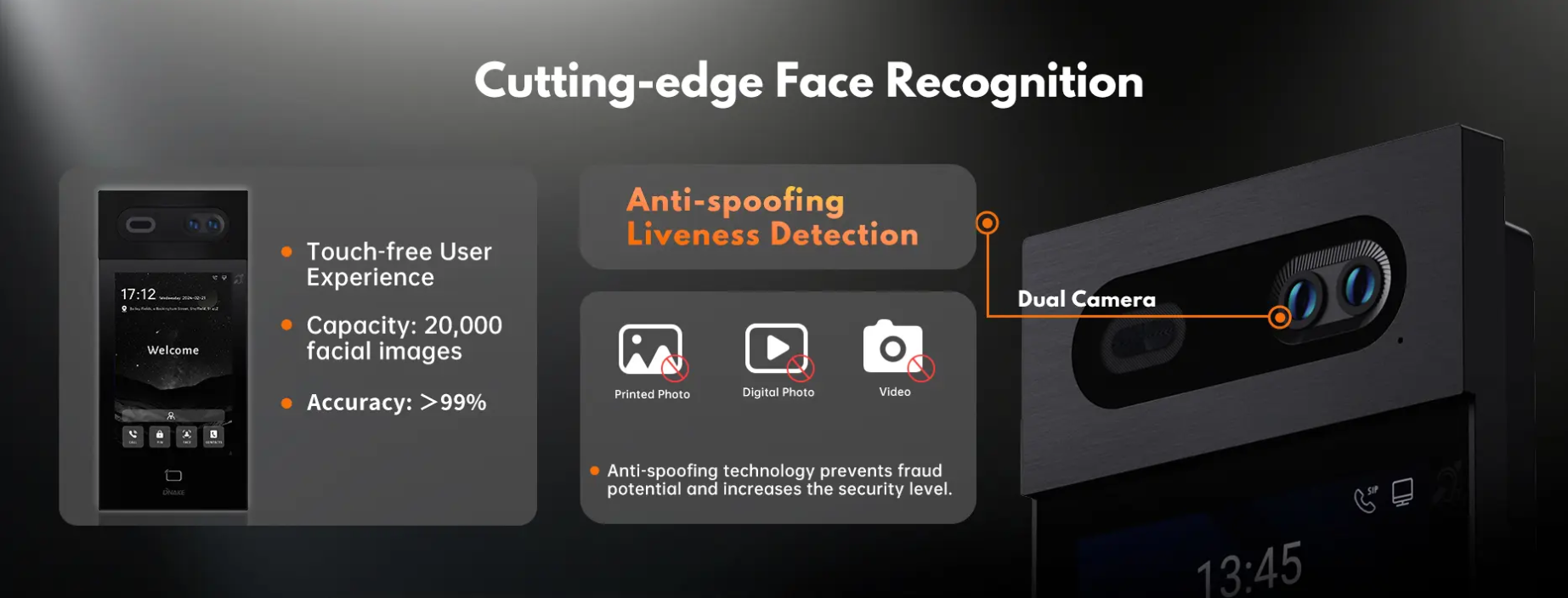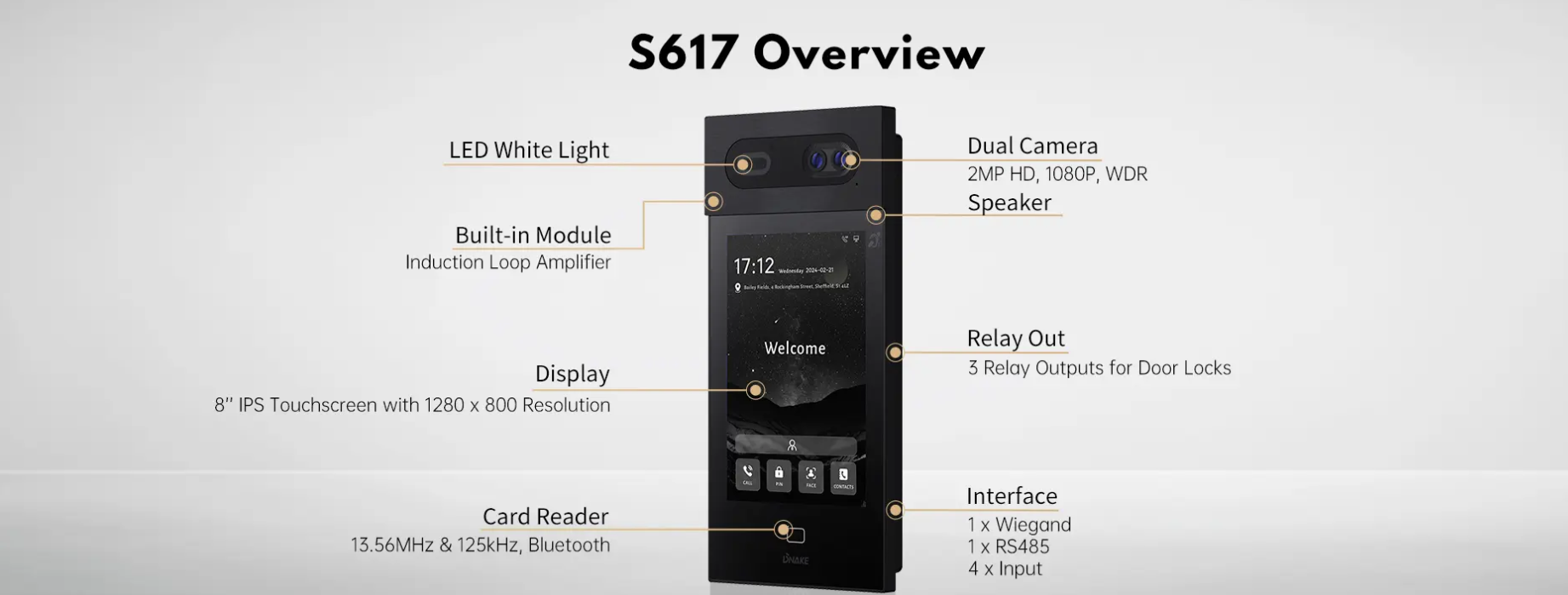 DNAKE S617 pakub integreeritud turvalahendust. See võimaldab avada ukse näotuvastusega (tuvastab ka kas kaamera ees on inimese foto või elus inimene), IC- ja ID-kaardiga ning PIN-koodiga. Samuti võimaldab see mugavat videokõnet sisemonitori ja mobiilirakendusega, pakkudes turvalist ja mugavat elukeskkonda.