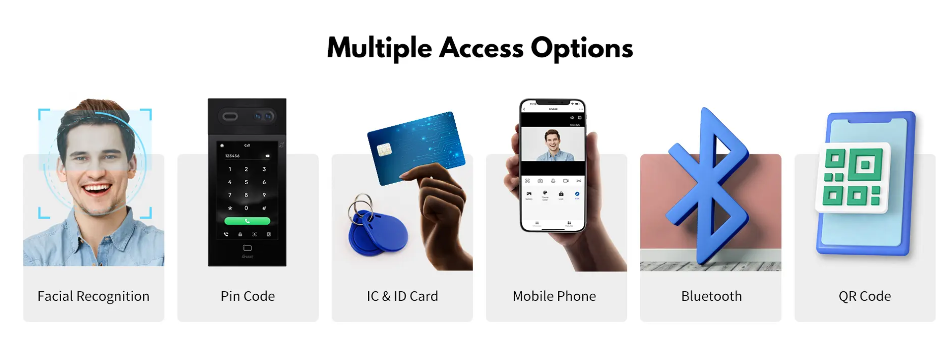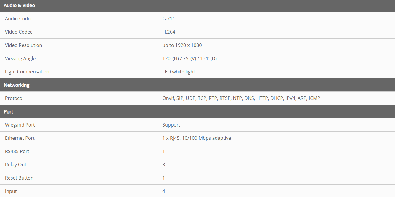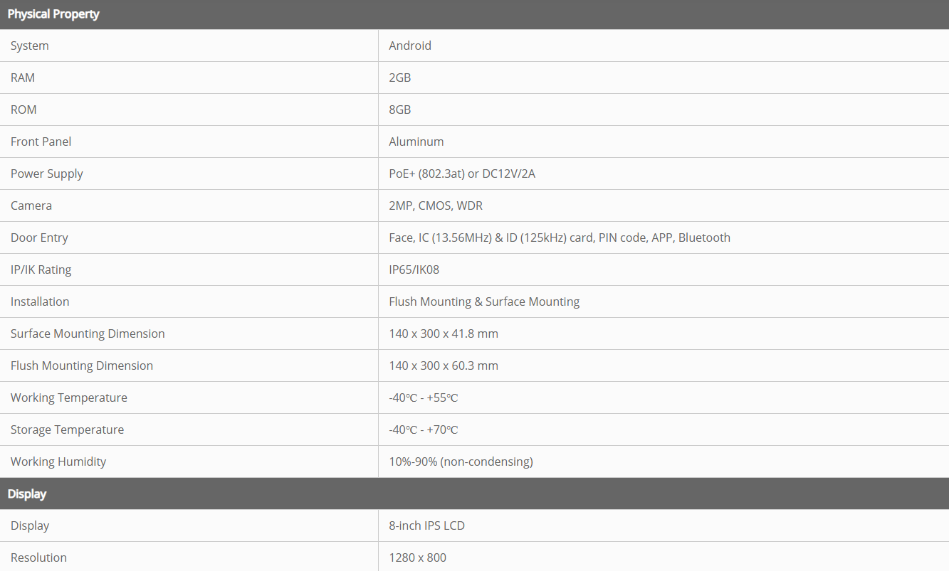 • Uksest sisenemise viisid: kõne, näotuvastus, IC-kaart (13,56 MHz), ID-kaart (125 kHz), PIN-kood, rakendus, Bluetooth
