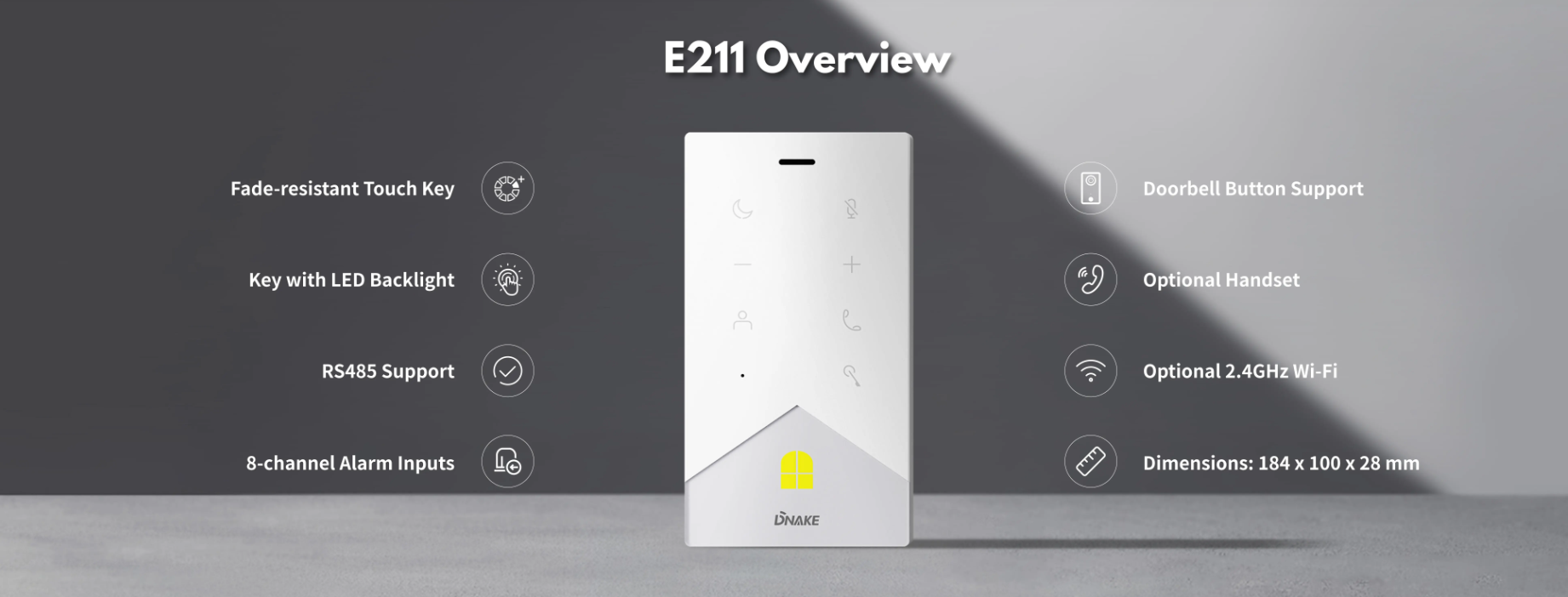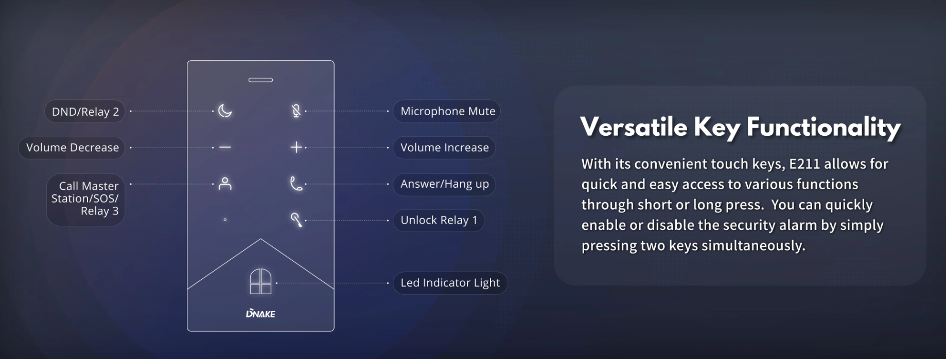 DNAKE E211 pakub mitmeid funktsioone, sealhulgas audiovaheside, hädaabikõne ja turvahäire jne. Samuti toetab see suhtlust SIP 2.0 protokolli kaudu IP-telefoni ja IP-PBX-iga. See võimaldab paigaldajal teha seadistamise ja paigalduse lihtsalt ja mugavalt.