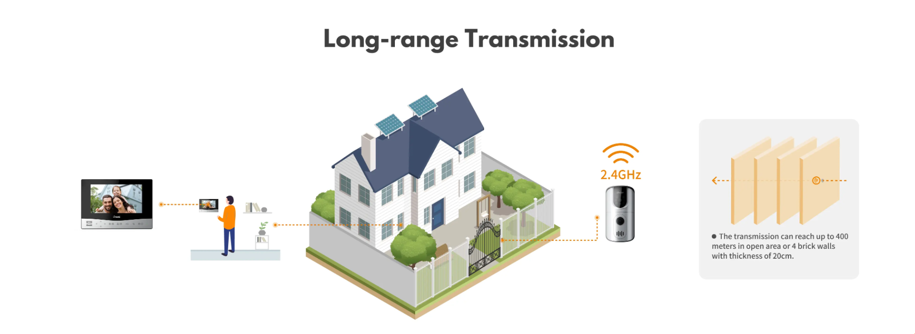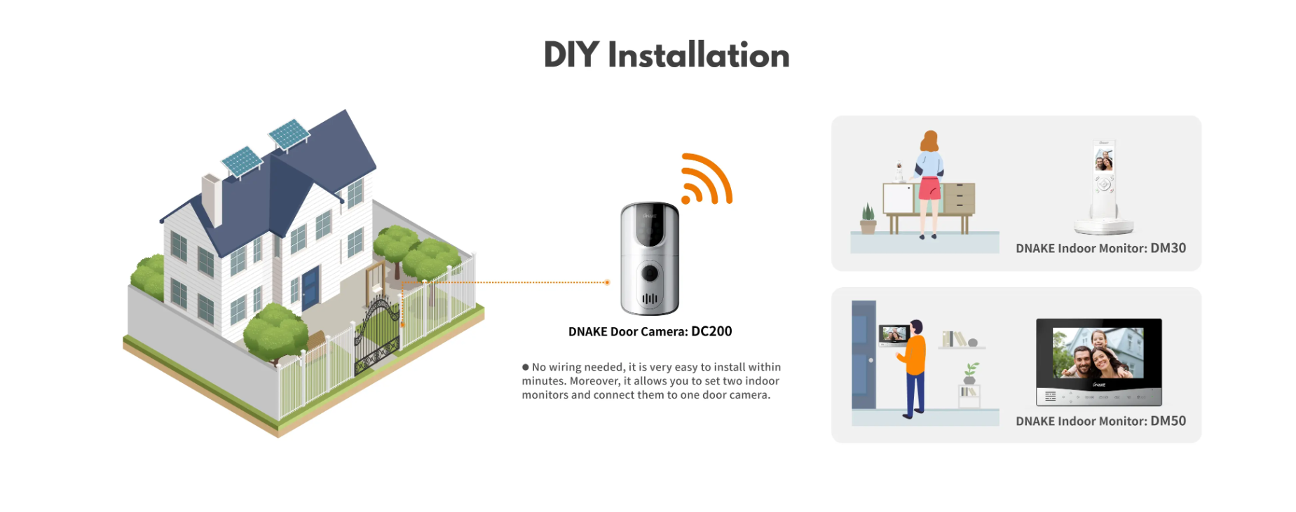 DNAKE juhtmevabad videouksekella süsteemid töötavad 2,4 GHz sagedusel. Iga uksekaamera võib olla ühendatud ühe või kahe sisemonitoriga. Süsteemi on lihtne paigaldada ning tavaliselt ei kaasne sellega täiendavaid kulusid, lisaks on sellel pikk tööraadius.