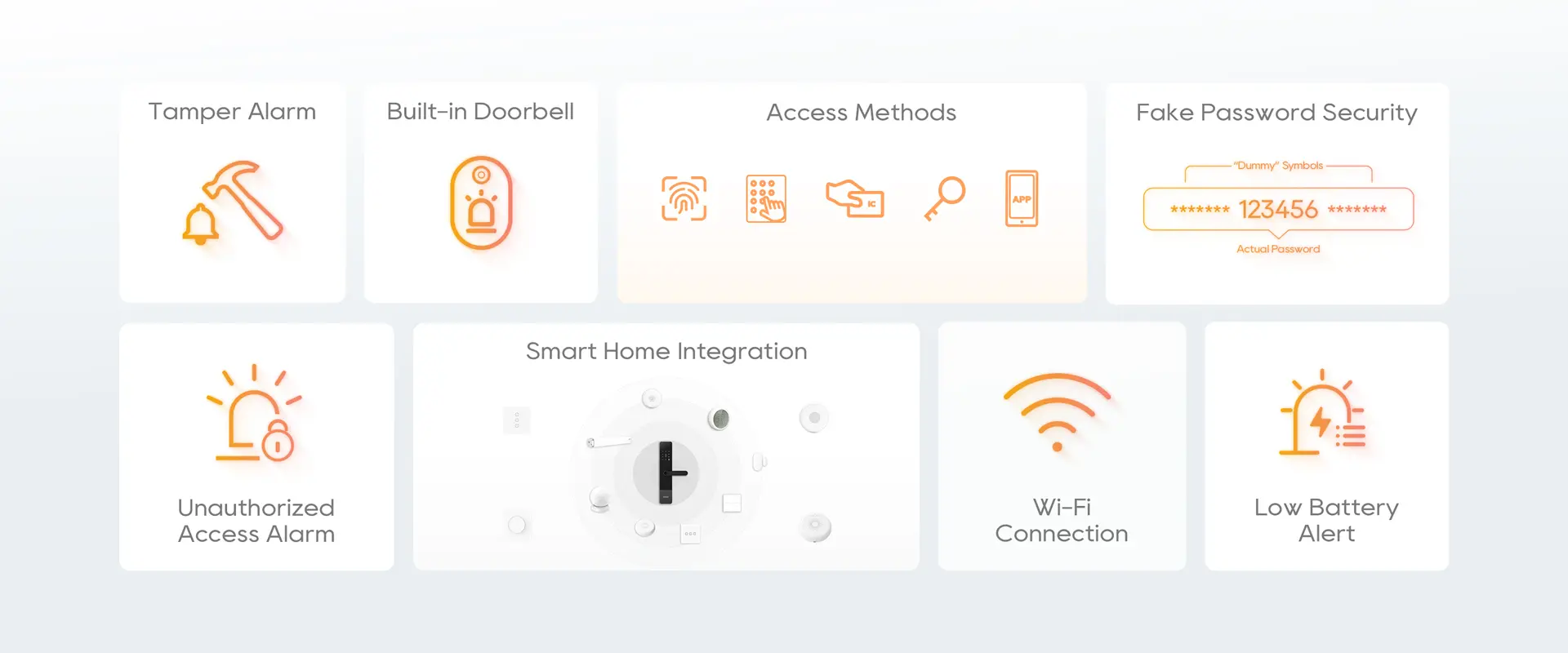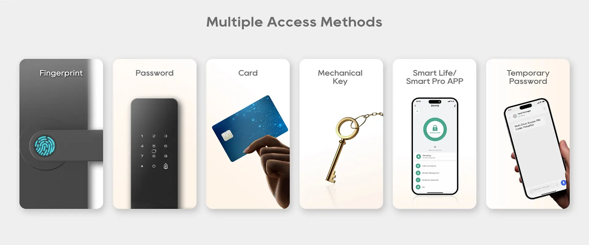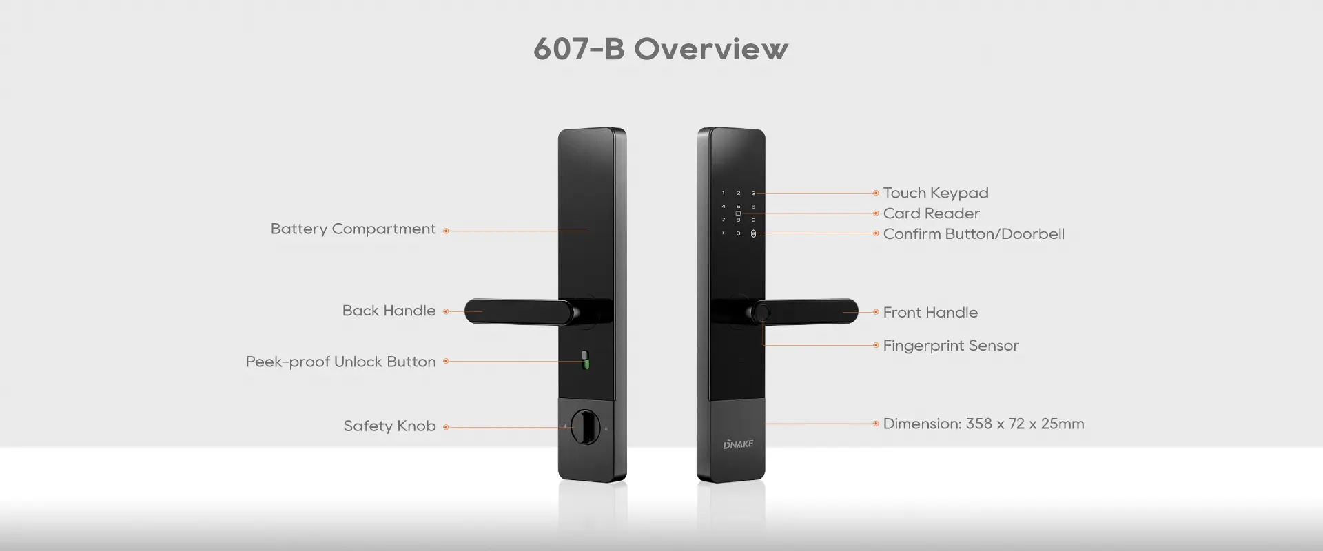 Dnake 607-B nutilukk pakub suurt mugavust. Selle lingil on sisseehitatud sõrmejäljelugeja – ukse saab avada ühe lihtsa haaramisega, ilma võtmeid otsimata. Avamiseks on viis võimalust: sõrmejälg, parool, kaart, mehaaniline võti või mobiilirakendus. Lukku saab juhtida ka kaugjuhtimise teel. See tagab sulle maksimaalse mugavuse ja turvalisuse igal ajal.