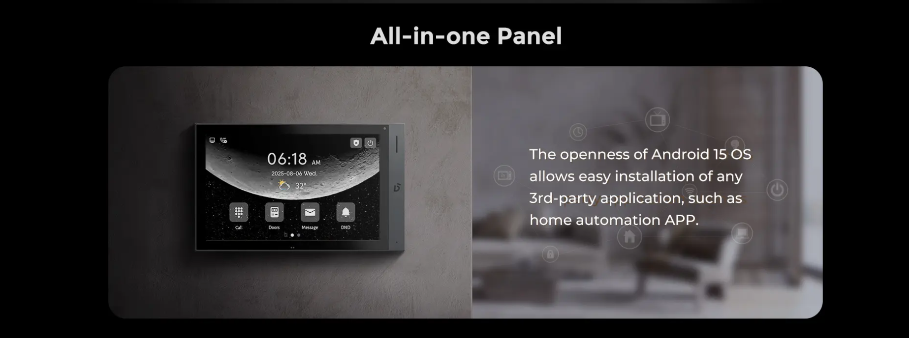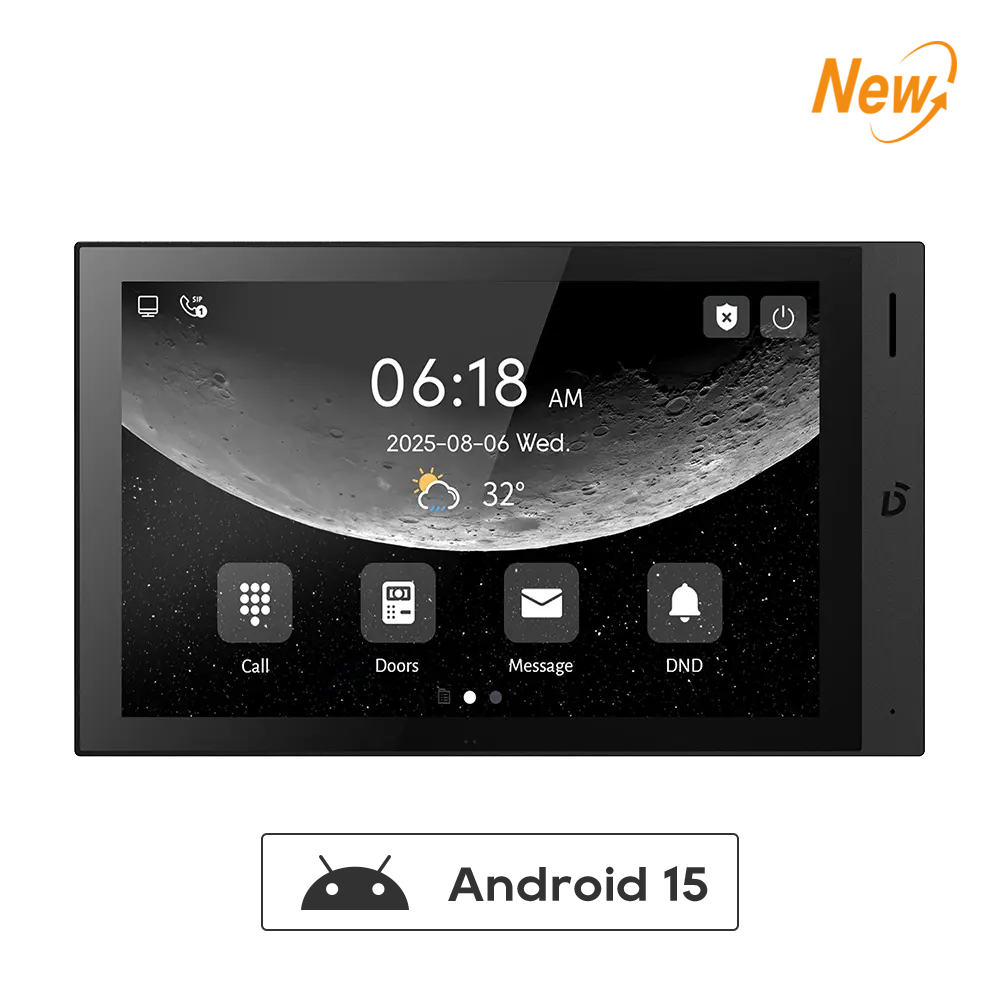 Android 15 operatsioonisüsteemiga DNAKE SIP-põhine sisemonitor võimaldab kõrglahutusega heli- ja videokommunikatsiooni uksejaamaga ning ruumidevahelist suhtlust SIP 2.0 protokolli kaudu. Samuti võimaldab see integreerimist kolmanda osapoole tarkvara ja liftijuhtimissüsteemiga, pakkudes terviklikku turvalahendust.