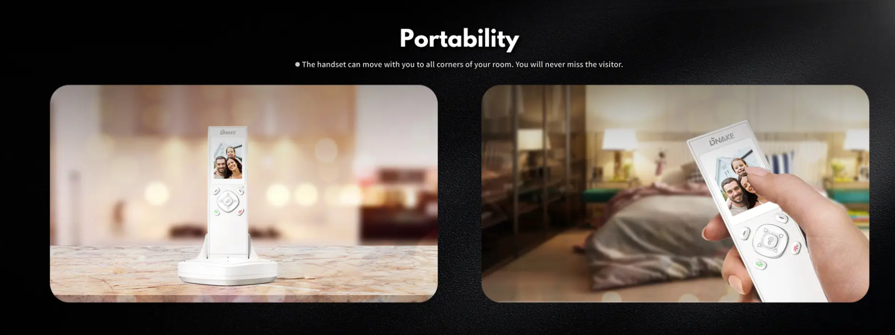 DNAKE juhtmevabad videouksekella süsteemid töötavad 2,4 GHz sagedusel. Iga uksekell võib olla ühendatud ühe või kahe sisepaneeliga. Süsteemi on lihtne paigaldada ning tavaliselt ei kaasne sellega täiendavaid kulusid, lisaks on sellel pikk tööraadius.