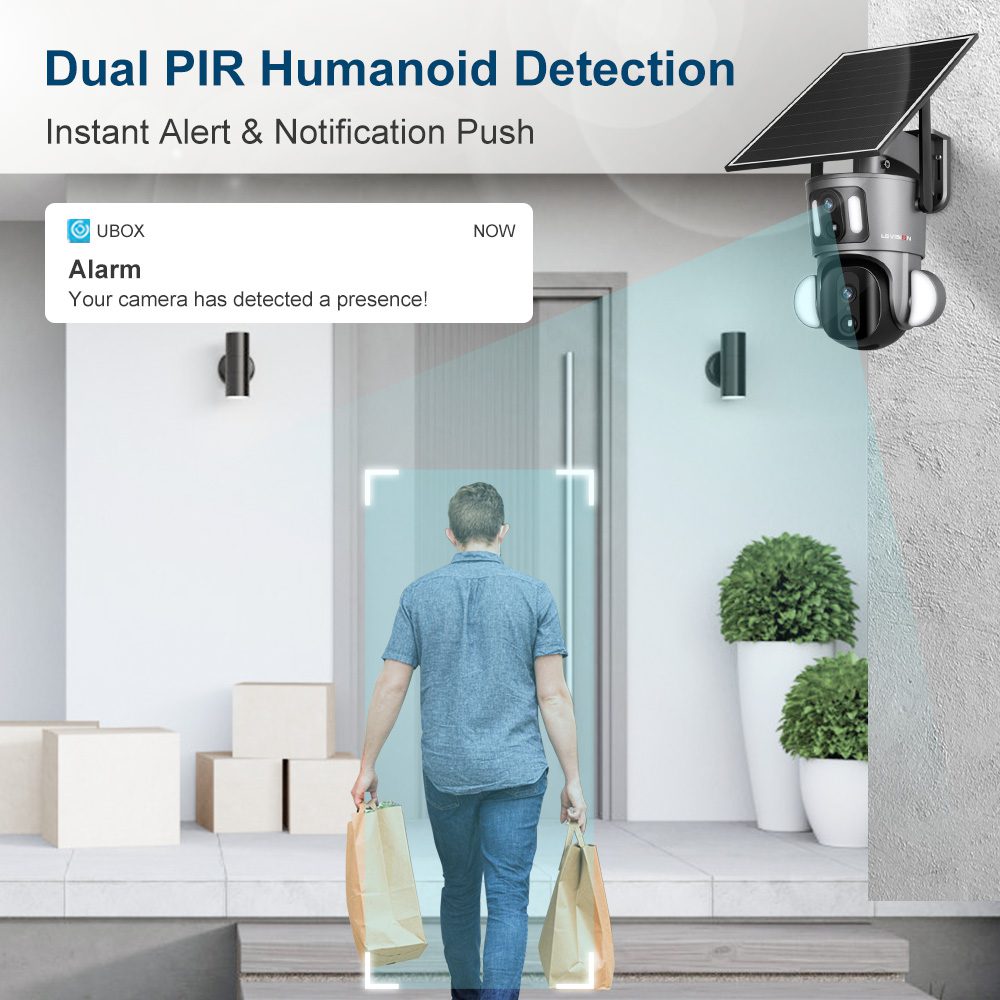 • Kahekordne PIR + AI inimese tuvastusega häire ja videosalvestus; PIR tuvastusulatus kuni 12 m.
