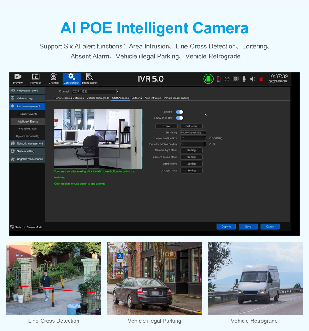 6. Six AI alert functions: Area Intrusion, Line-Cross