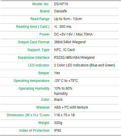 See NFC-lugeja on peamine väliste Wiegand lugejate lisaseade kõigile Daosafe läbipääsukontrolli seadmetele. Elegantse ja vastupidava disainiga seadet on lihtne ühendada ja paigaldada ning see võimaldab juhtida ühte ust mõlemalt poolt. LED-tuled näitavad lubatud või keelatud ligipääsu. Lugemiskaugus on kuni 10 cm. Kuna see seeria on veekindel ning töötemperatuur jääb vahemikku -25 ºC kuni +75 ºC, on see sobilik lahendus ka välitingimustes paigaldamiseks.