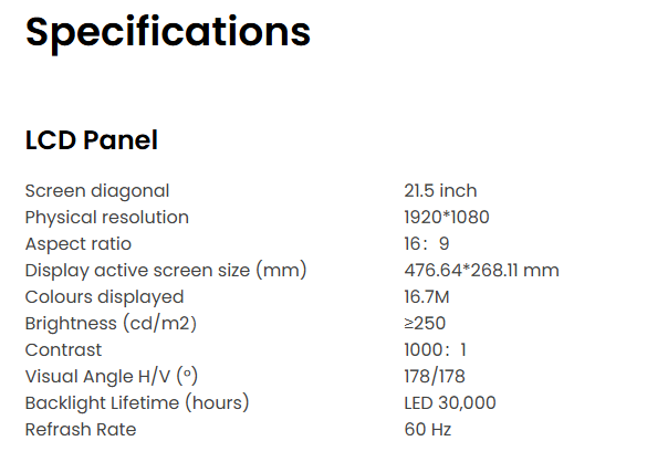 21,5″ tasapinnaline, 7. taseme löögikindla klaasiga ekraan, mis tagab täpse ja kiire puutereageerimise